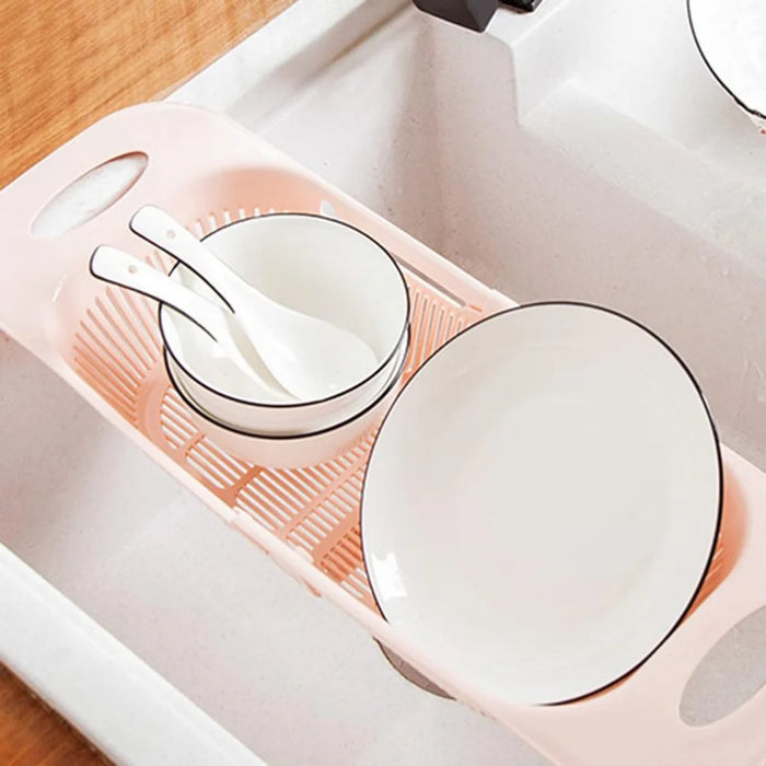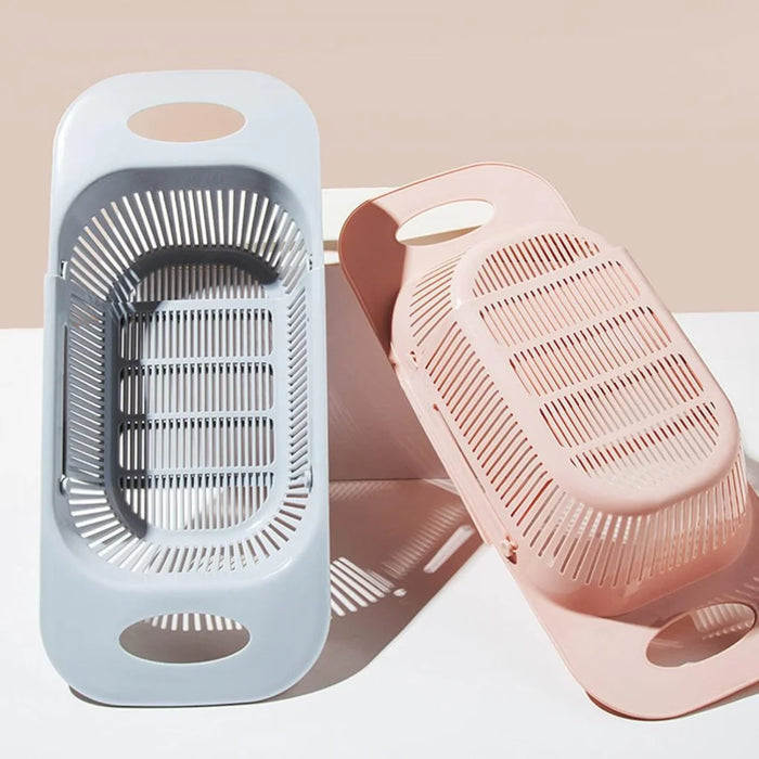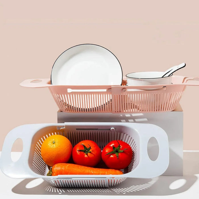 Escorredor de pia retrátil com alças e cesto ajustável para frutas e legumes.
